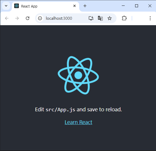 -> 자동으로 리액트 페이지가 띄워짐 (열리지 않았다면 http://localhost:3000/ 으로 직접 열면 됨 !)