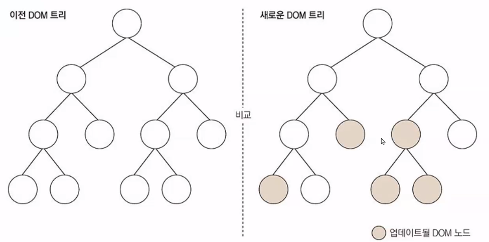 - 이전 Virtual DOM에 있던 내용과 현재 내용을 비교함