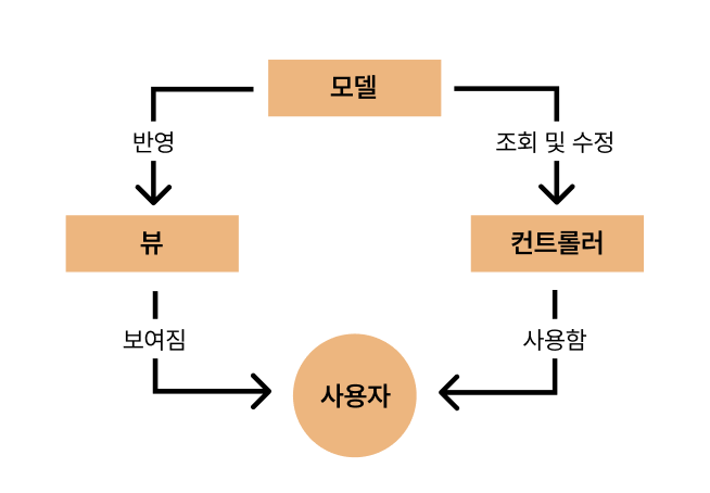 프로그램이 사용자에게 어떤 작업(예: 버튼 클릭, 텍스트 입력 등)을 받으면 컨트롤러는 모델 데이터를 조회하거나 수정하고, 변경된 사항을 뷰에 반영