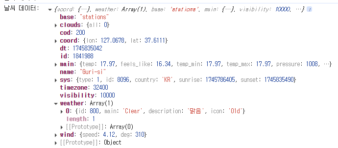 여기서 날씨 API로부터 받아온 `data`를 콘솔에 출력해보면 다음과 같은 구조를 볼 수 있다.